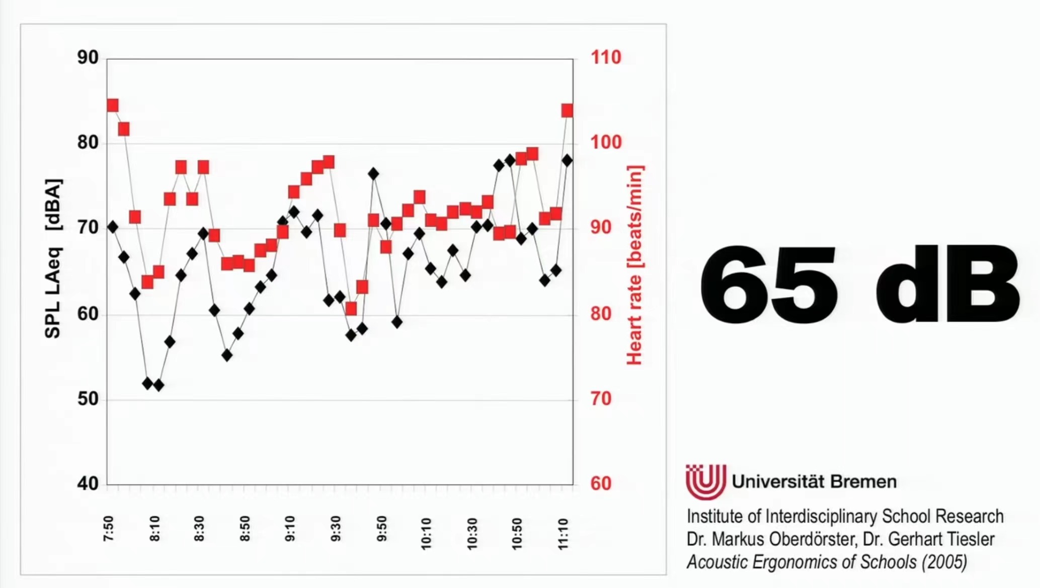 在混响过长的教学环境下,受影响的可不止学生。德国不来梅大学的研究发现,教室的噪音平均分贝值为65dB。而德国环境专家委员会曾表明,65dB是导致心肌梗塞的危险阈值。