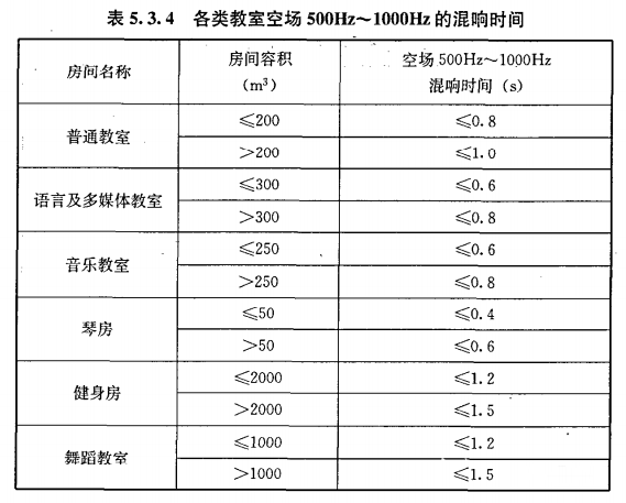 根据《民用建筑隔声设计规范GBJ118-2010》,房间面积≤200m²普通教室混响时间需要≤0.8s,>200㎡的混响时间控制在1s以下为最佳。如果是多媒体教室和音乐教室这类功能性场所,对混响时间要求更高,最低需要控制在0.6s以下。