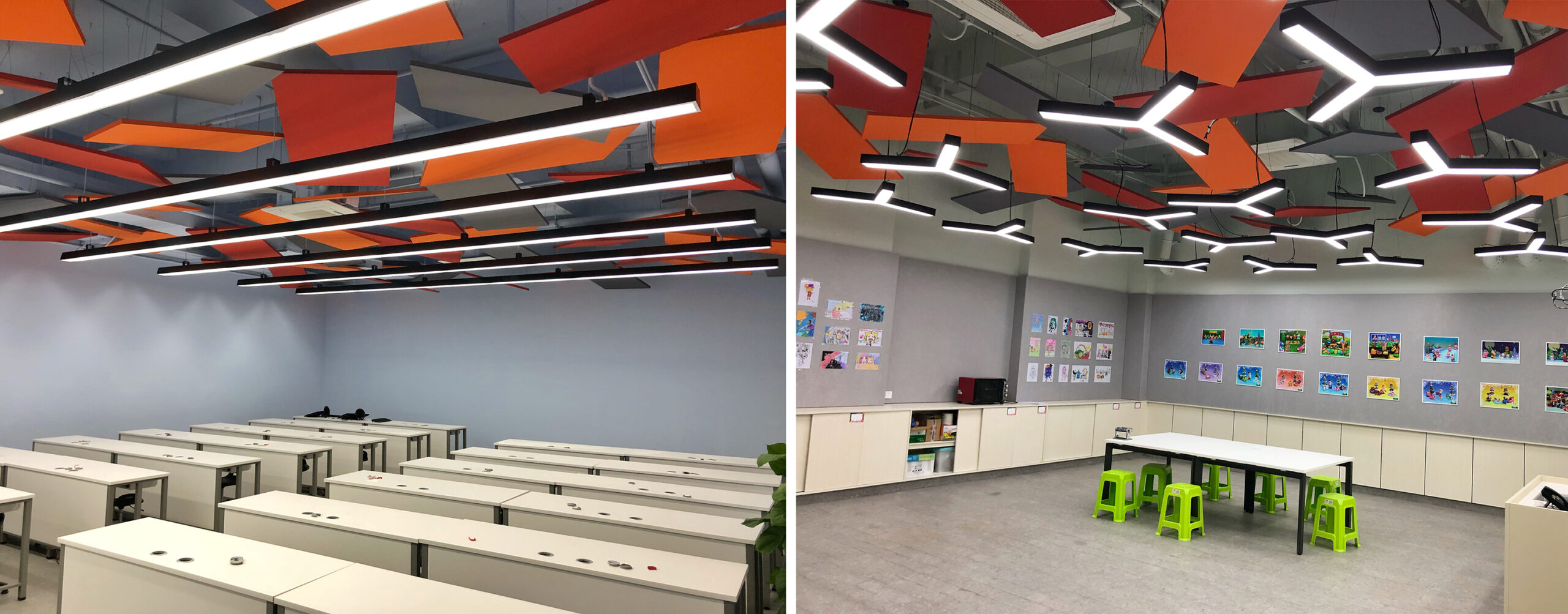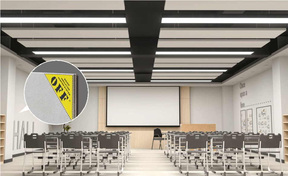 教课室中常采用的吸声材料是中高频吸声板,分散分布在空间中以获得均匀的声场,使不同区域的学生都能清晰听到授课的内容。