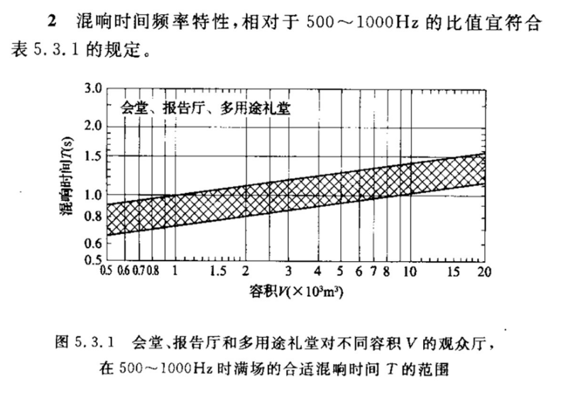 其次,GB/T 50356-2005《剧场、电影院和多用途剧场声学设计规范》中规定了多功能厅堂的混响标准,在频率为500-1000Hz时,根据不同的容积对应的混响时间范围如下表所示。