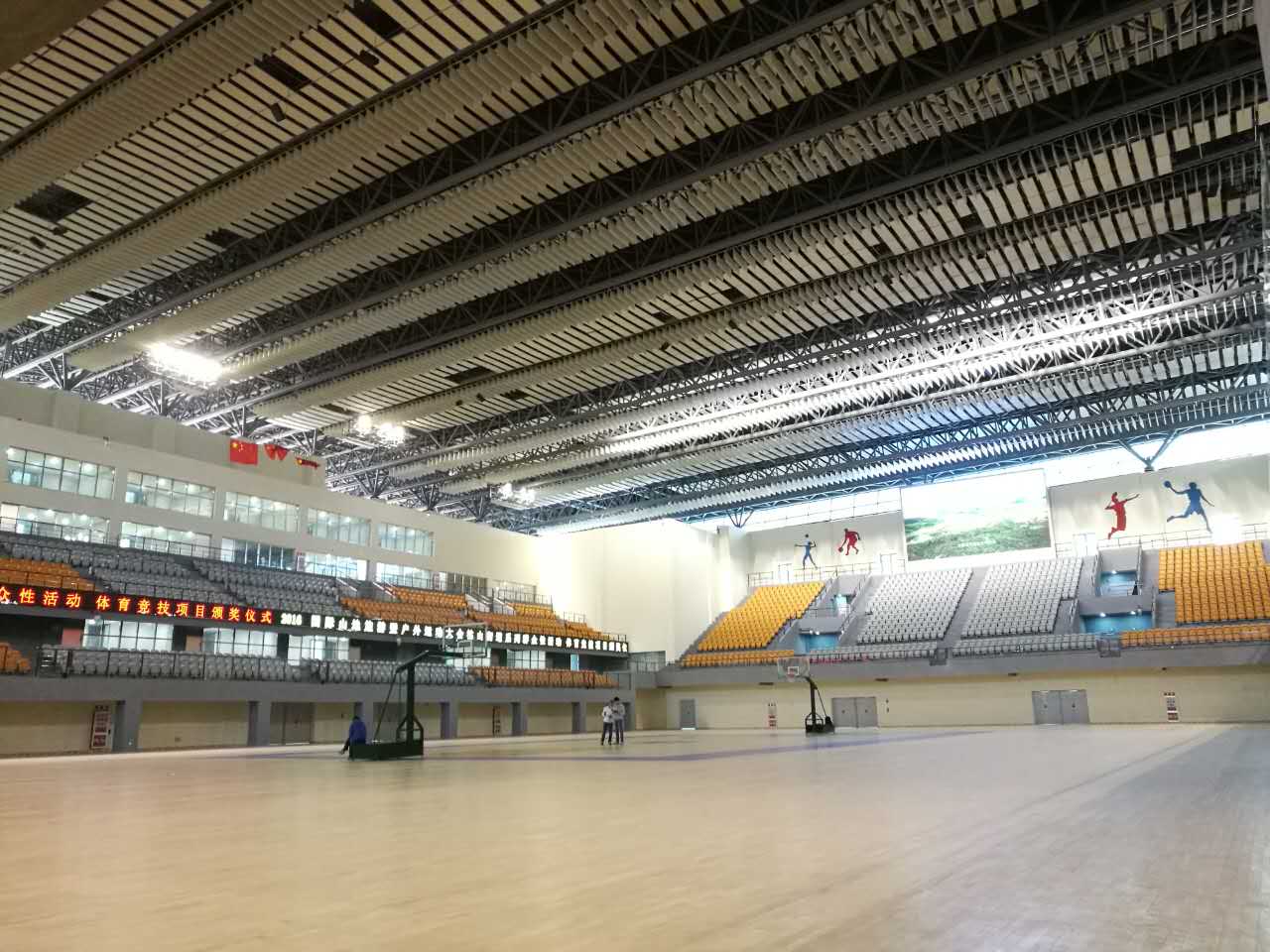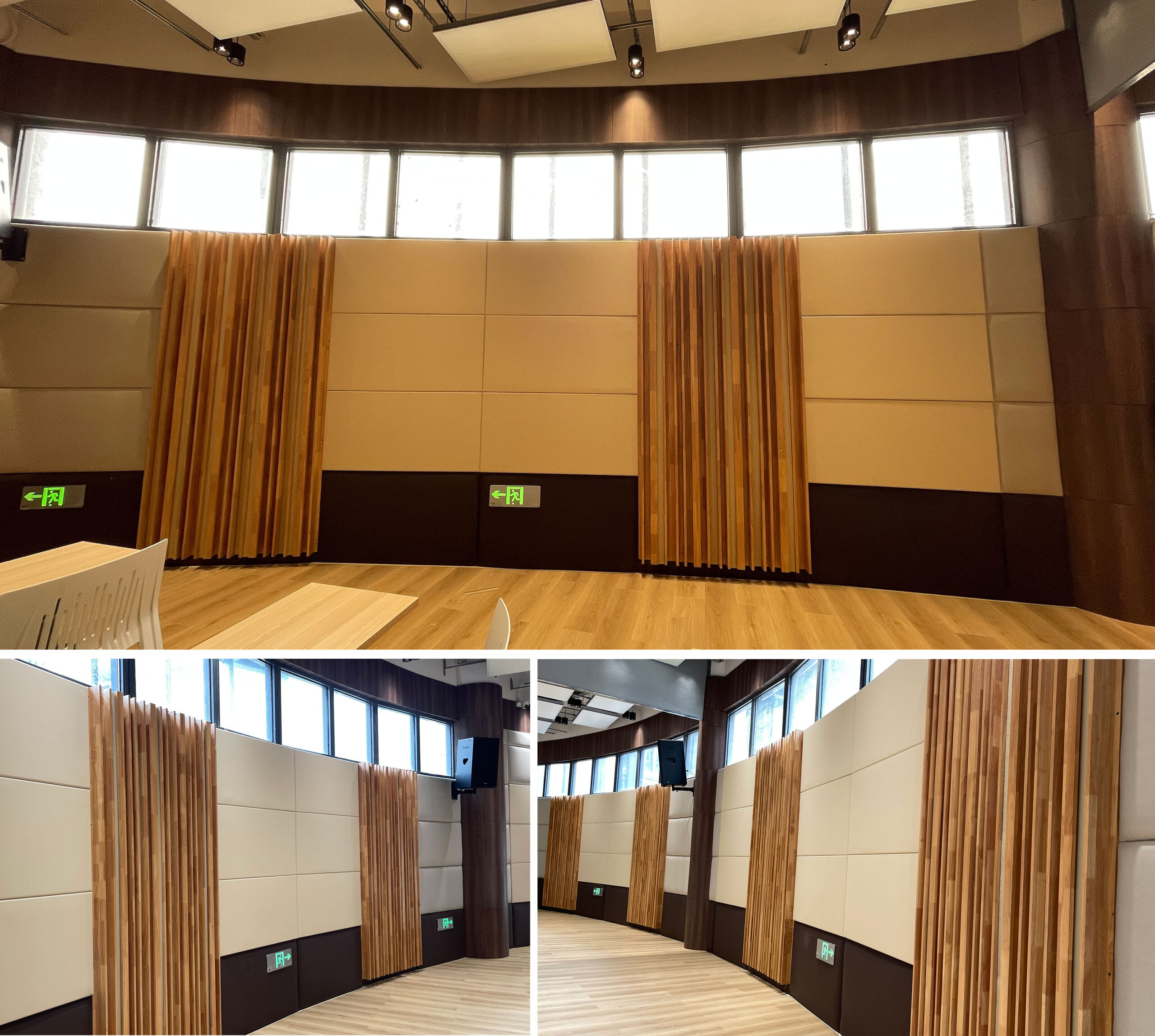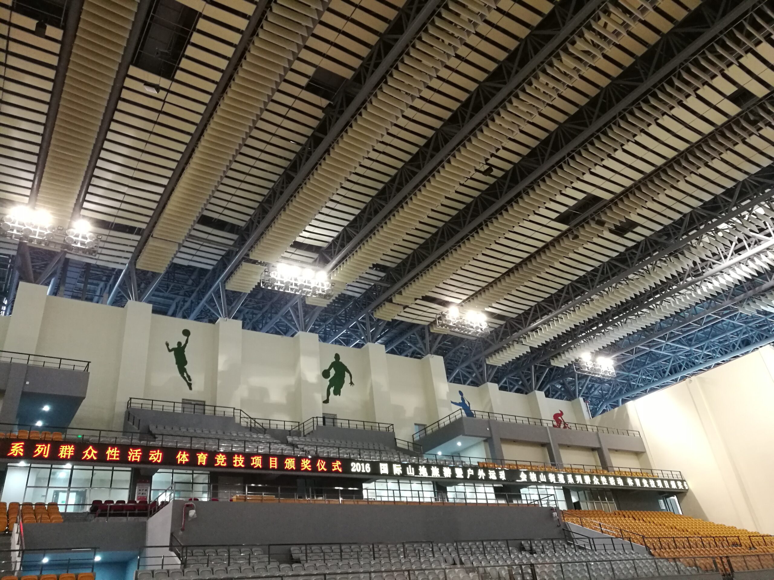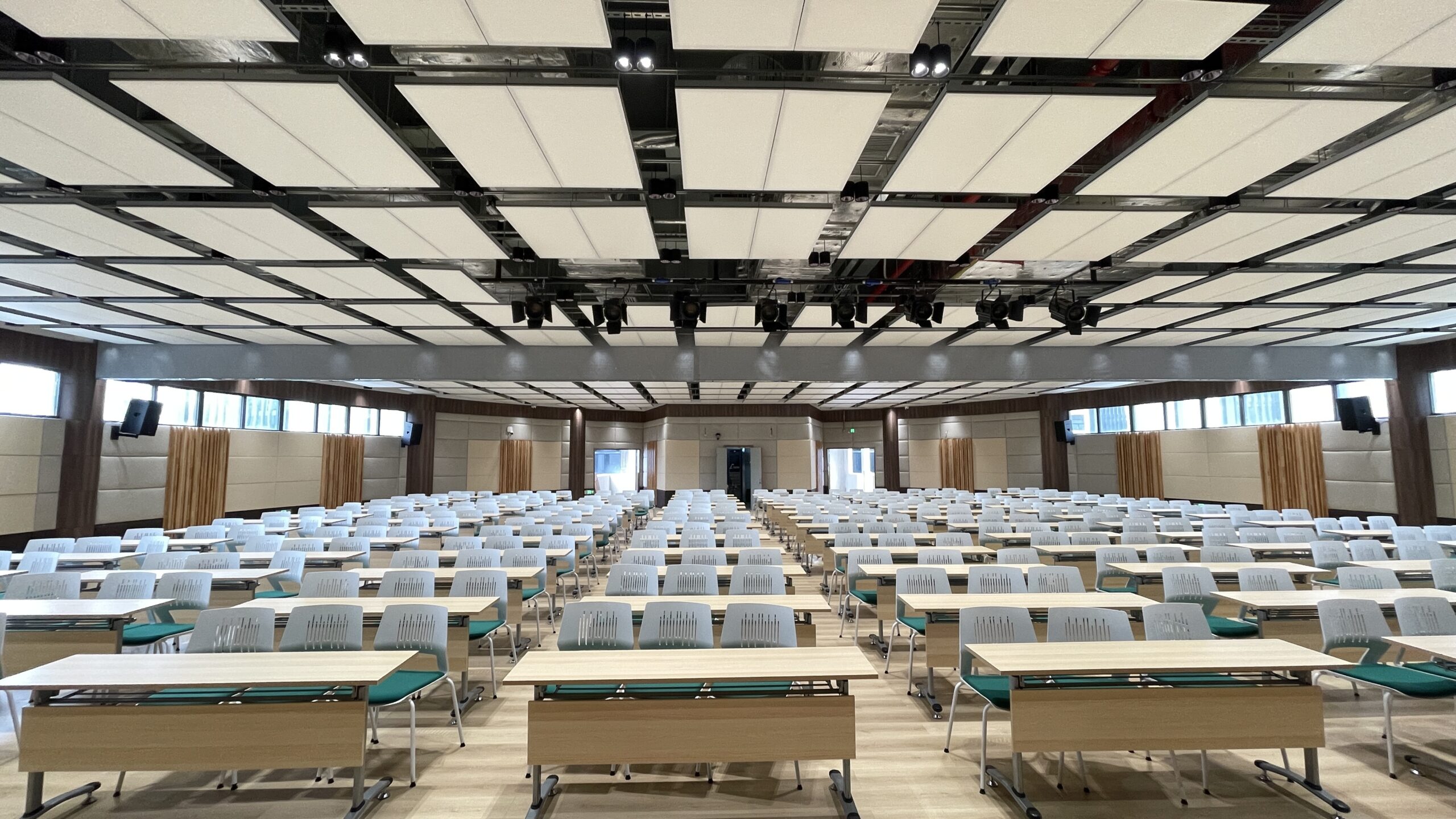体育馆内设计重点在于顶部采取强吸收中高频处理,在天花处水平吊挂阵列声学障板。