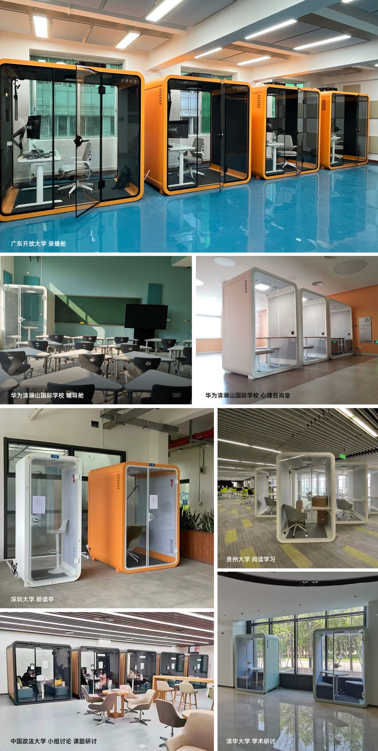 在办公场所中很常见的静音舱,在教育场景中的使用也非常广泛。这是阅读学习、小组讨论、课题研讨和学术研究的理想场所,不仅如此,这个私密空间还适用于一对一访谈、心理辅导、朗读、录音……