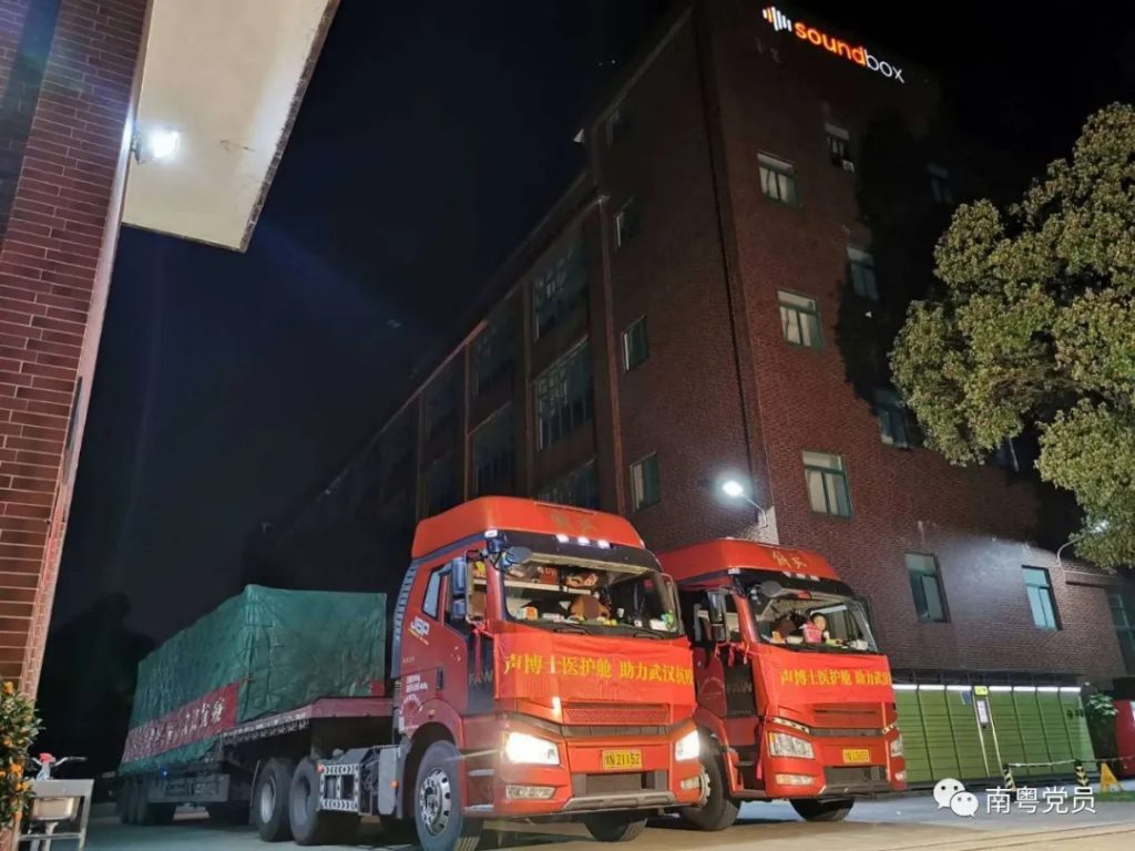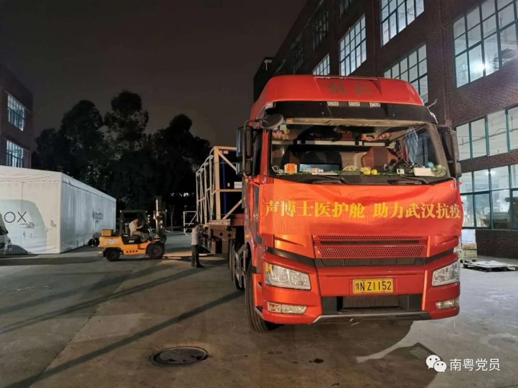 2月27日首批「移动式医用防护隔离舱」正式交付到长江方舱医院、武汉第九医院,用于支援武汉抗击新型冠状病毒疫情。3月23日第三批援鄂物资–声博士医护舱正式启运,为打赢疫情防控的阻击战贡献一份力。声博士科协主席殷艺敏先生表示:能为疫情做出自己的一份贡献,非常的自豪,同时,也是每一位声博士员工应尽的责任。