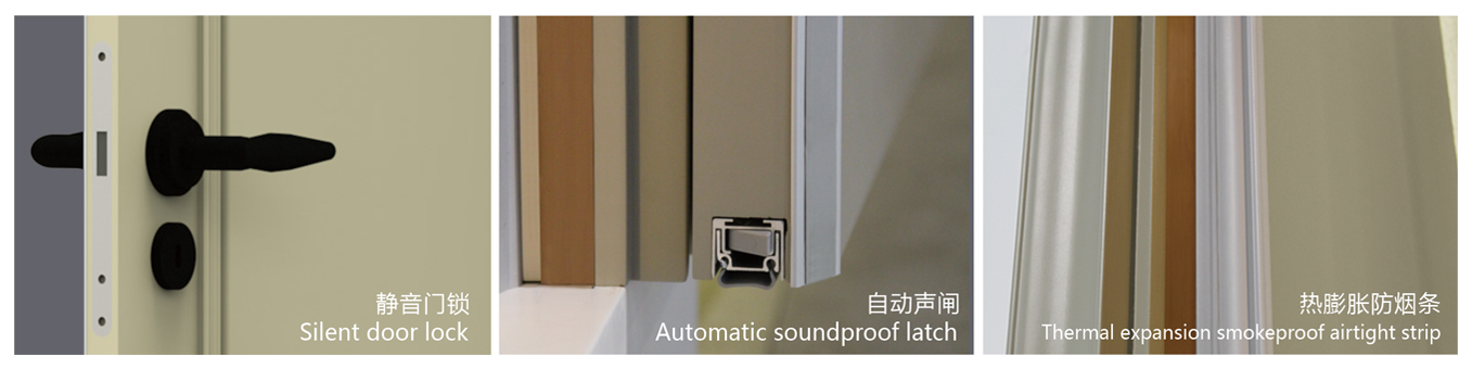 新技术新材料隔声效能获得电脑演算优异数据,门体实物隔声有效性经实验室测试高度吻合。配套热磁吸附阻尼密闭胶条和封闭式静音门锁,新增空气隔声量的同时,有效降低开关时门页碰撞声和门锁机械声。