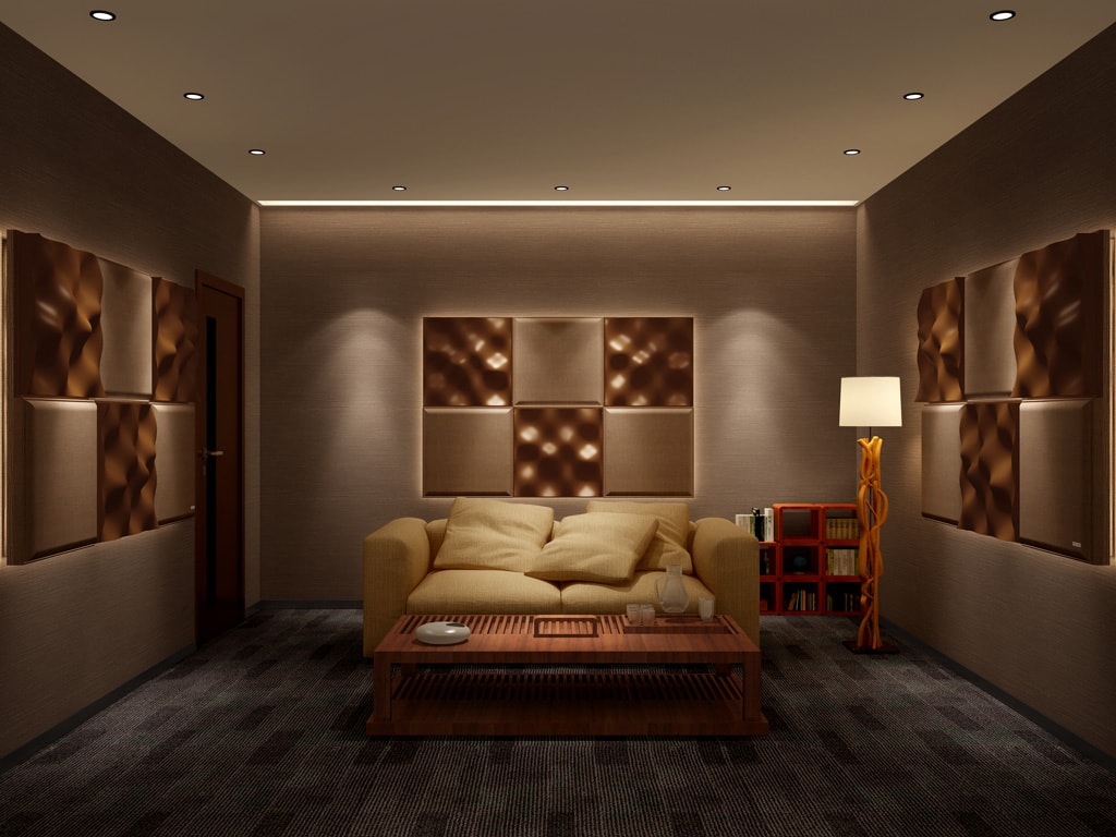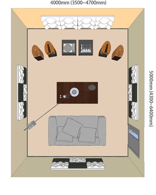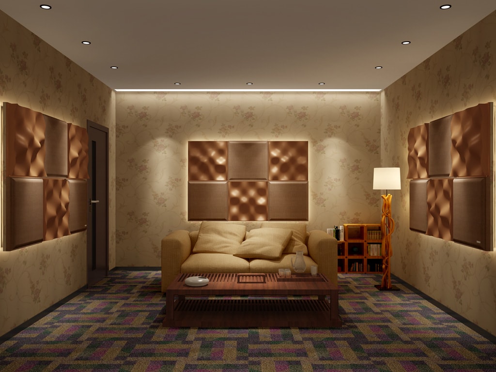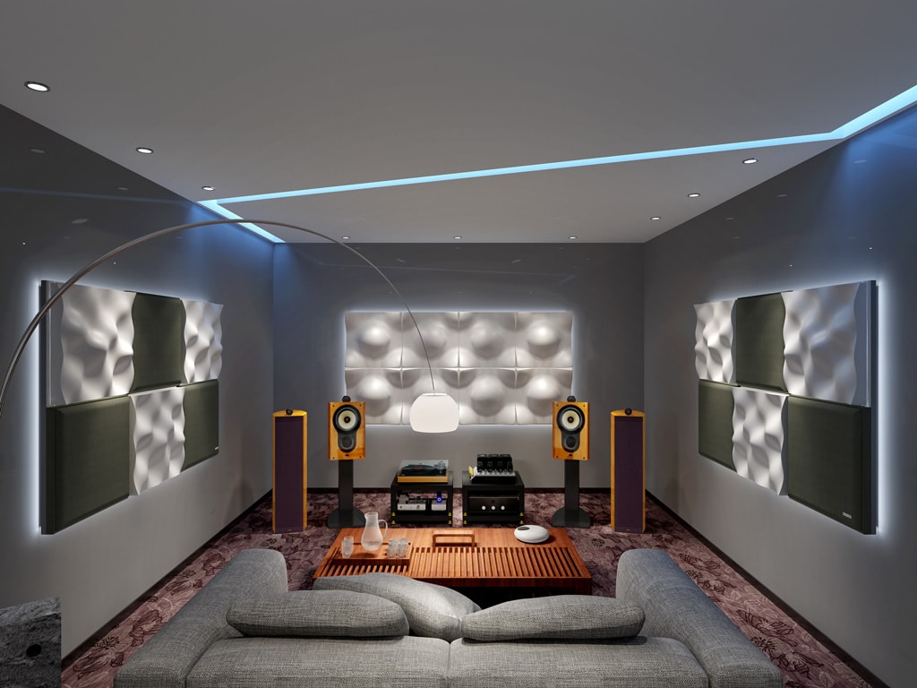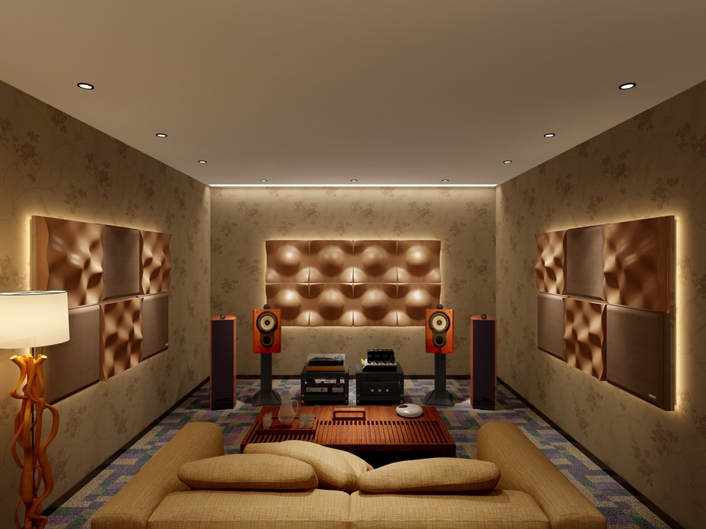 Combination: Front wall –extensive broad band diffusers combination, the rest three walls placed with semi diffusion and semi absorption acoustic combination.