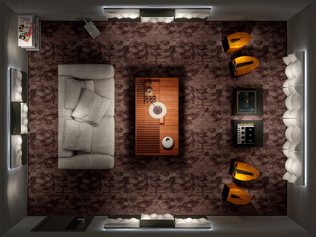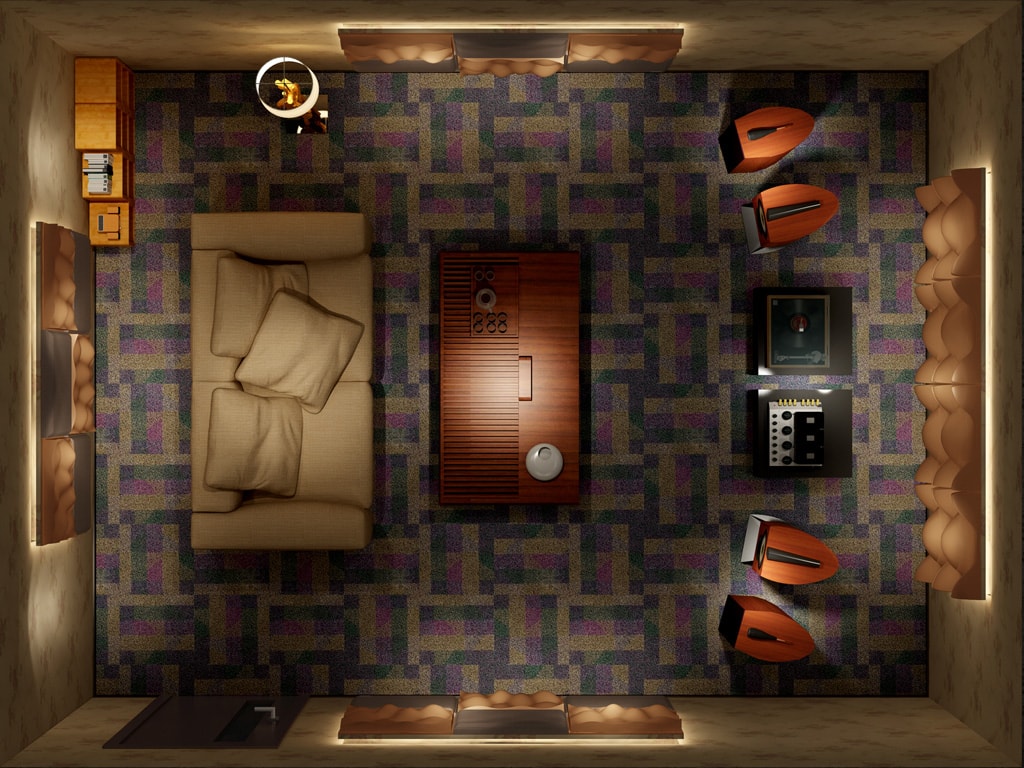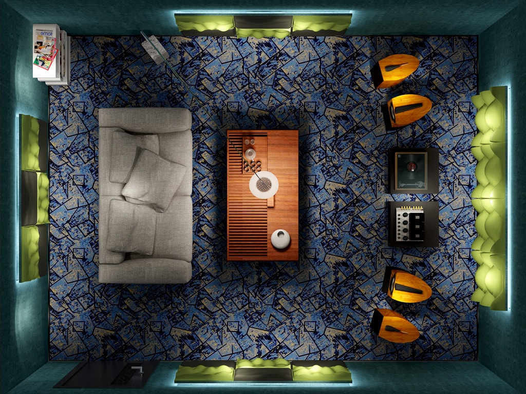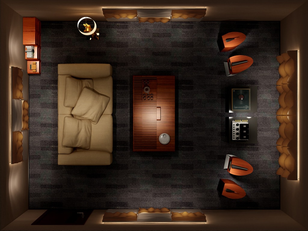 Combination: Front wall –extensive broad band diffusers combination, the rest three walls placed with semi diffusion and semi absorption acoustic combination.