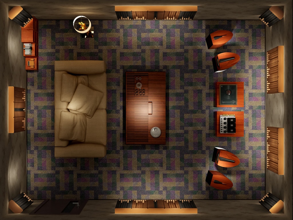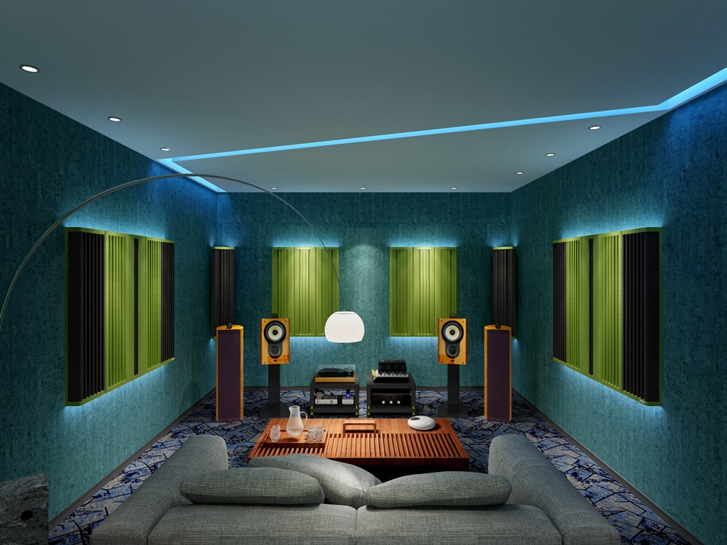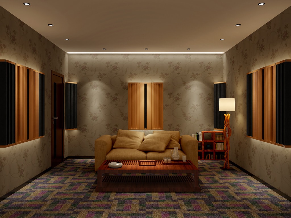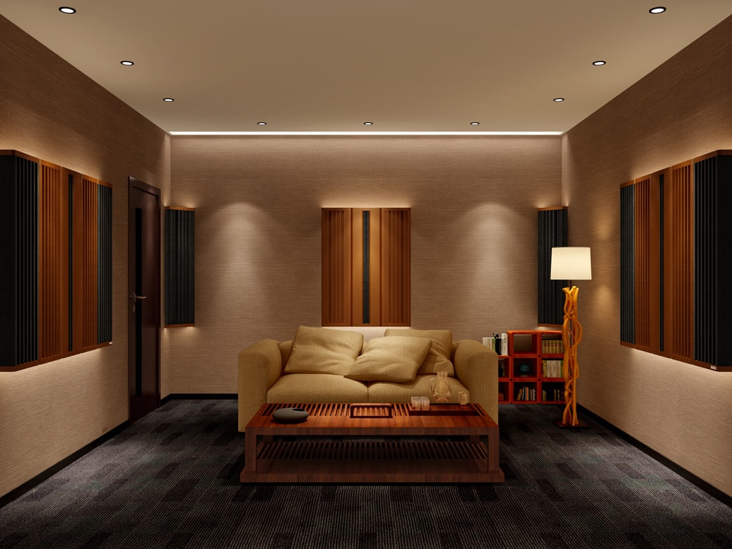 组合特性:四立面墙身安置25%全频吸收,75%中高频扩散声学板,容易形成驻波的4个墙角安置宽频角位低频陷阱