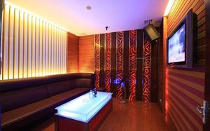 6、隔聲天花板:ktv防火隔音天花板傳播樓層之間的噪聲也是不可忽略的問題,一般採用弔掛定型吸聲板,距離天花板10-25cm,掛勾宜帶彈簧,用來減弱板面的聲振動,避免引起吸聲板面振動,而發出干擾噪聲。