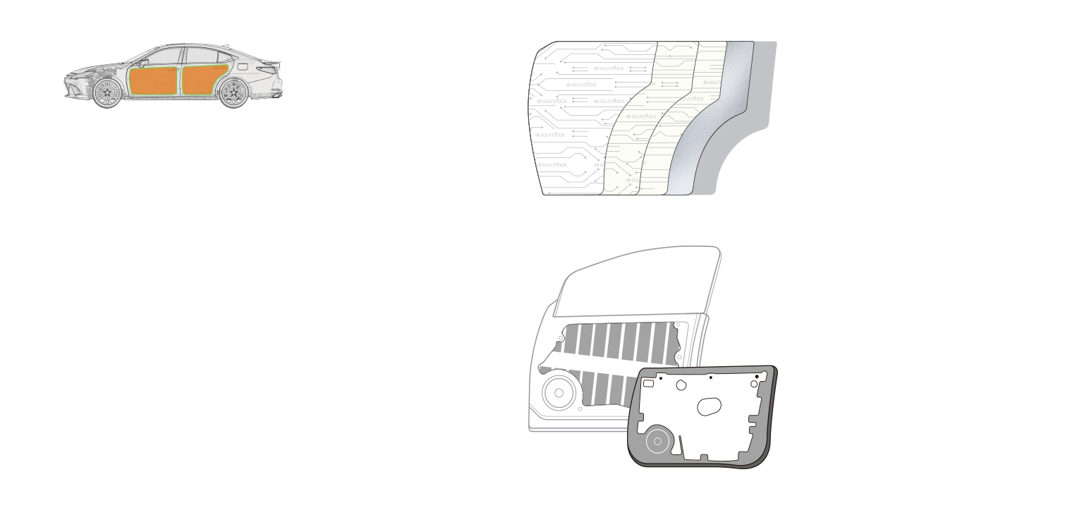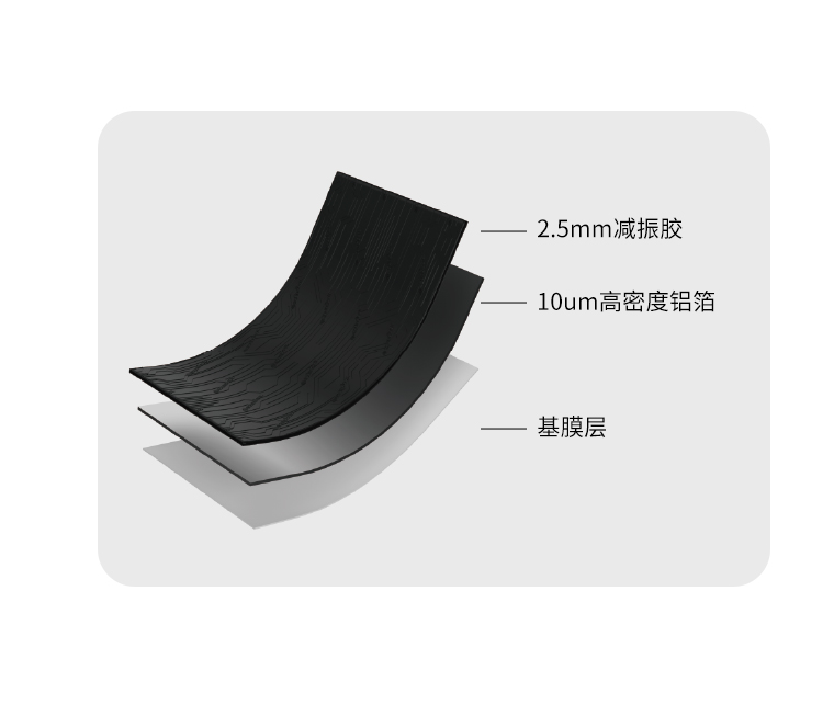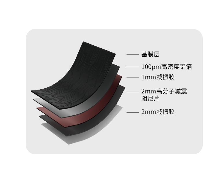 超高密度高分子IIR阻尼隔声减振胶复合高密度铝箔贴在车身饭金表面,作为一种粘弹性材料,有效减少噪声、减少震动根据车身位置不同搭配IIR劲量阻尼隔声减振胶,让隔声减震效果更加显著提升。