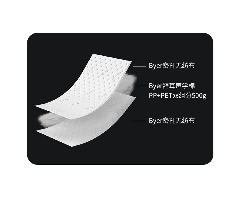 3D立体蓬松网状连续多孔纤维材料,有着大量细密微小的空隙这使得声波能方便、有效地进入微腔体的深层转变为震动而被消耗和吸收,且能有效地消除反射波,尤其是对中高频噪音具有突出的吸收特性;有助于汽车NVH降噪性能的提升。