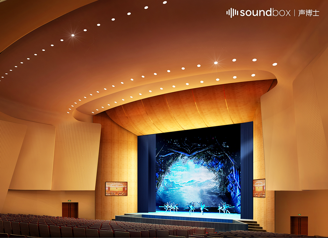 流线屋顶重复运用,建设规模为35800平方米,其中地上建筑面积为27985平方米,地下建筑面积为7815平方米。按使用性质,分别为大剧场、小剧场和电影院。其中大剧场,观众座席数为1480座,为大型乙等剧场。小剧场主观众座席数为500座。电影院设4个观众厅,观众总座席数为600座。按使用功能和区域划分为舞台部分,观众厅部分,后台部分、后勤办公部分及观众休息厅。