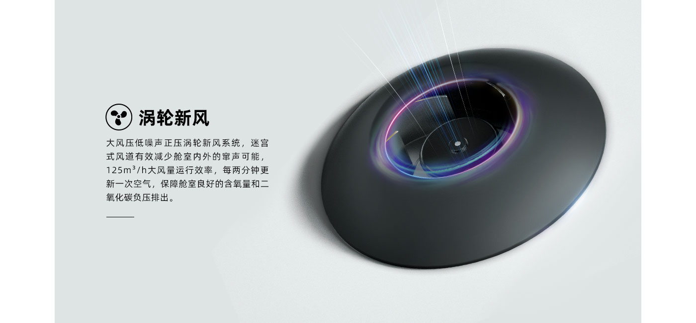 ★涡轮正压新风系统,进风量>120m³/h,舱内噪声≤30dB
